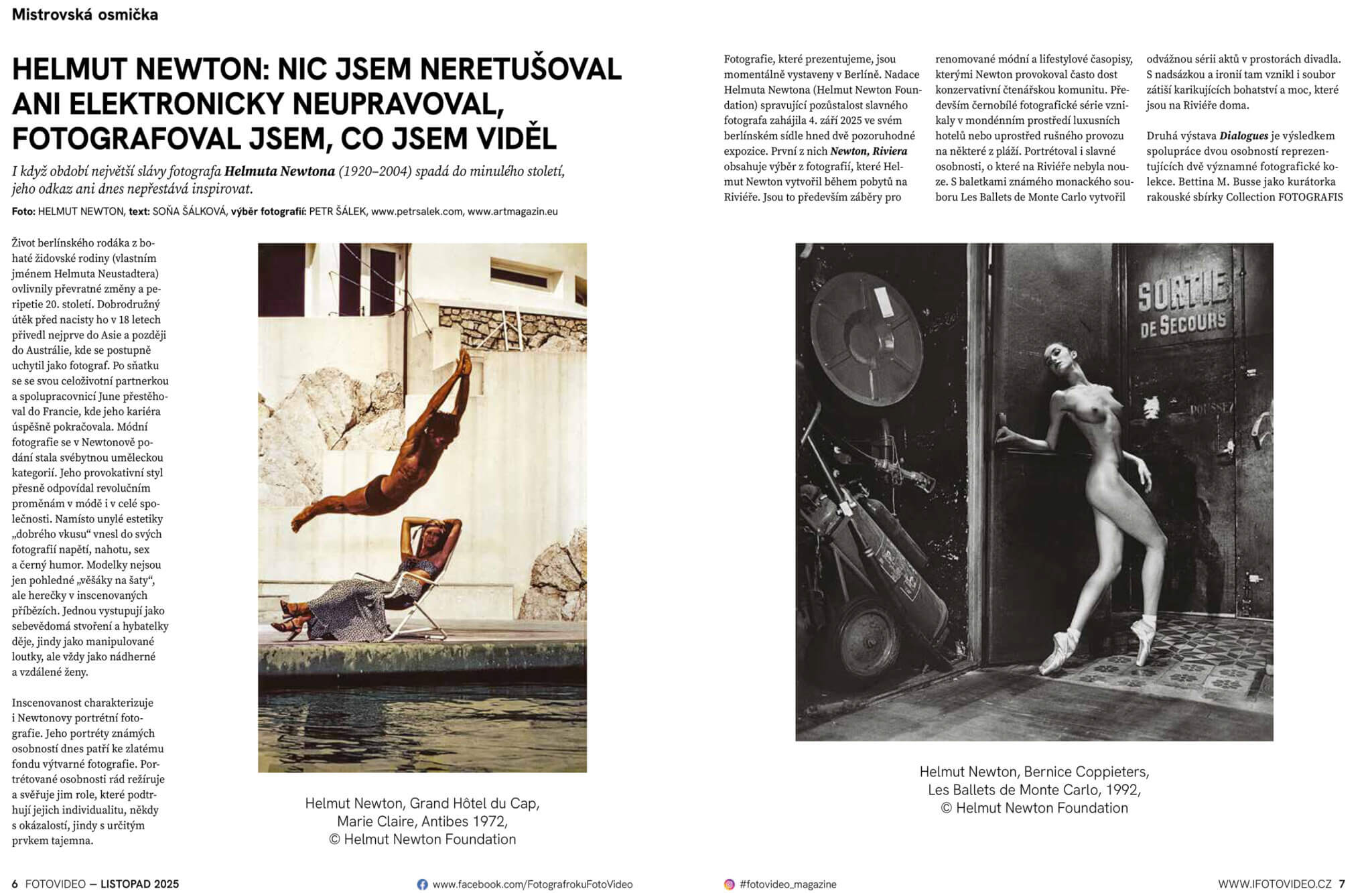 Číslo otvára profil jednej z najväčších ikon svetovej fotografie – Helmuta Newtona. Redakcia sa pozrela na dve výstavy, ktoré v septembri otvorila berlínska Helmut Newton Foundation: Newton, Riviera a Dialogues. Výber snímok dopĺňa pohľad na Newtonovu schopnosť budovať napätie, pracovať s nahotou, inscenáciou a iróniou spôsobom, ktorý bol pre svoju dobu provokatívny a dodnes je mimoriadne moderný.