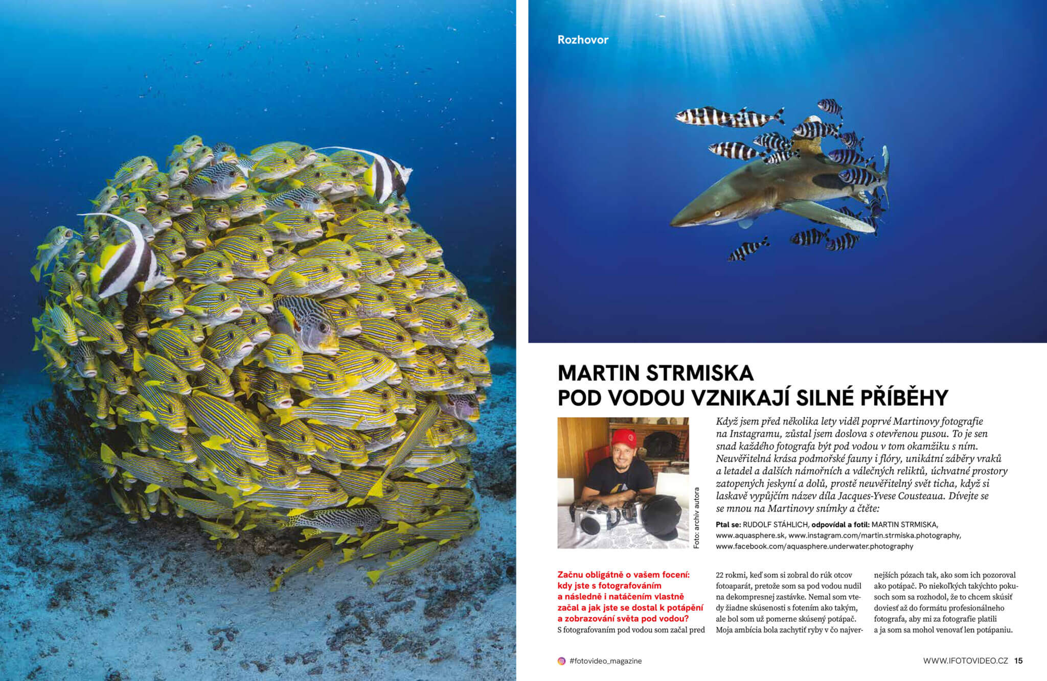 Ďalšou veľkou témou je fascinujúci svet pod hladinou v rozsiahlym rozhovore s Martinom Strmiskom. Podvodný fotograf opisuje prostredie, kde svetlo mizne, farby sa menia, tlak rastie – no príbehy sú o to silnejšie. Martin spomína ponory so stovkami kladivohlavých žralokov, fotografovanie vrakov a zatopených baní aj fyzicky náročné momenty, keď pri čakaní na správny okamih zadržiava dych tak dlho, že „cíti, ako mu bije srdce v krku“.