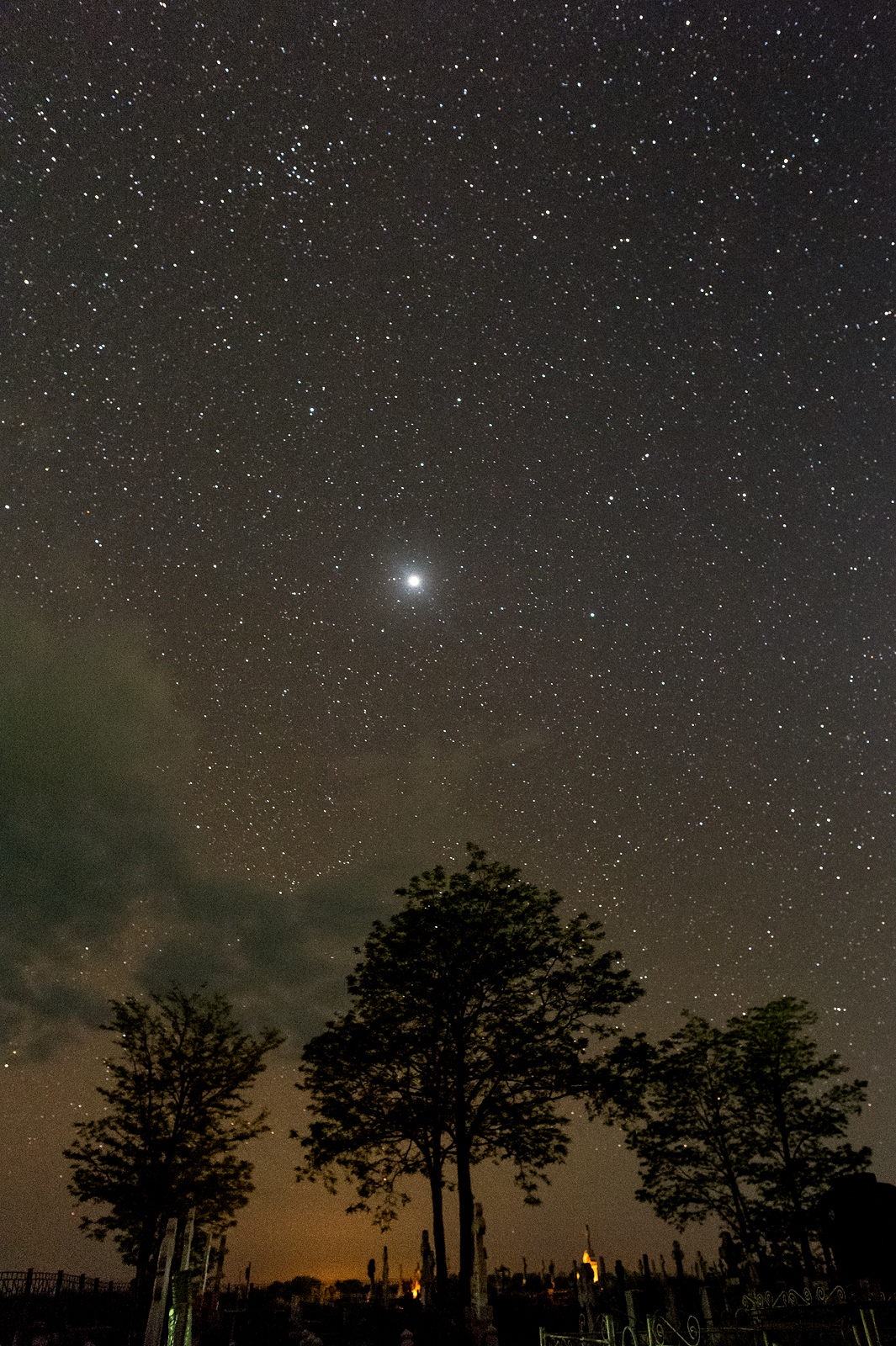 Najťažšou úlohou sa však nezdala byť správna expozícia. Podľa Tomášových rád sa na displejoch aparátoch začali ukazovať správne exponované obrázky, ktoré sme ešte individuálne podľa citlivosti fotoaparátov doladili. Ako väčší problém sa ukázalo, že moderné objektívy nemajú v porovnaní so staršími typmi označenie pre astrofotografiu a často nemajú ani stupnicu zaostrenia. Neplatí jednoducho, že stačí zaostriť na „nekonečno“ a je po starostiach. Vtedy je celý obraz rozostrený. Bolo potrebné na niekoľko pokusov nastaviť zaostrenie. Niektorým fungovalo automatické zaostrenie na svetlá mestečka a následné prepnutie do manuálneho zaostrovania. Ja som zaostrenie riešil pomocou skúšania a hľadania najlepšieho bodu vzhľadom na to, že som chcel kompromis v ostrosti – aby bolo podľa možnosti ostré aj neďaleké stromy a pomníky aj pozadie.