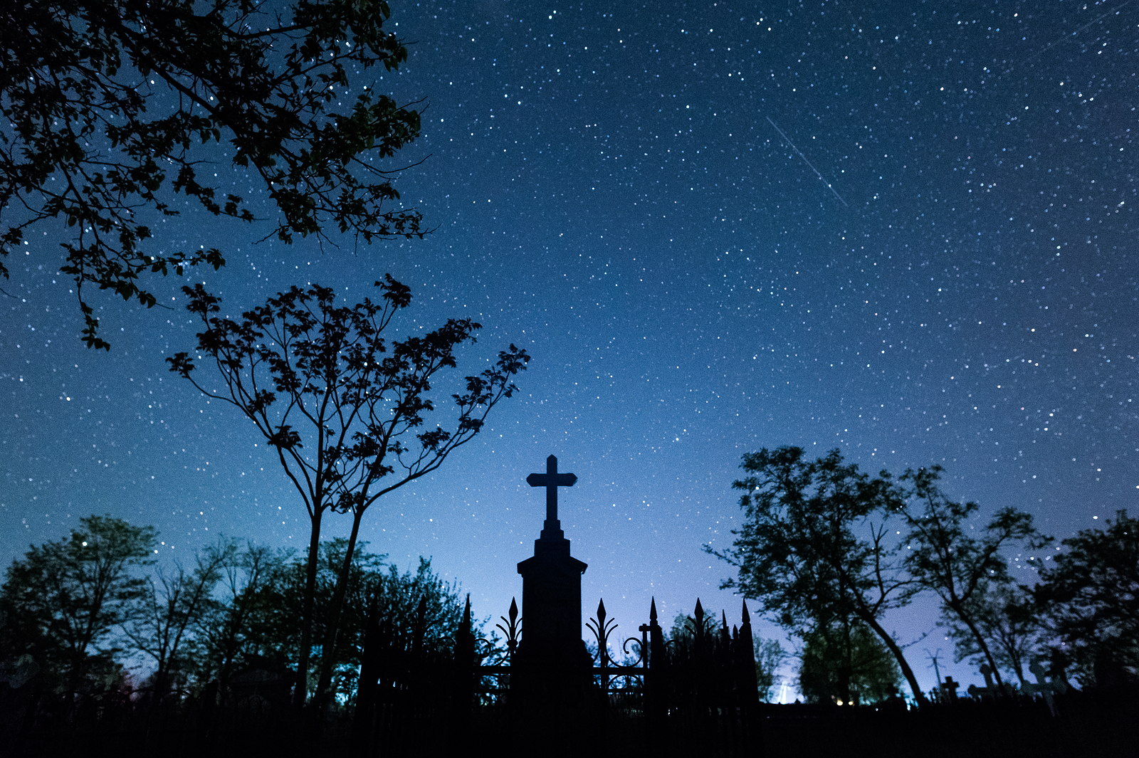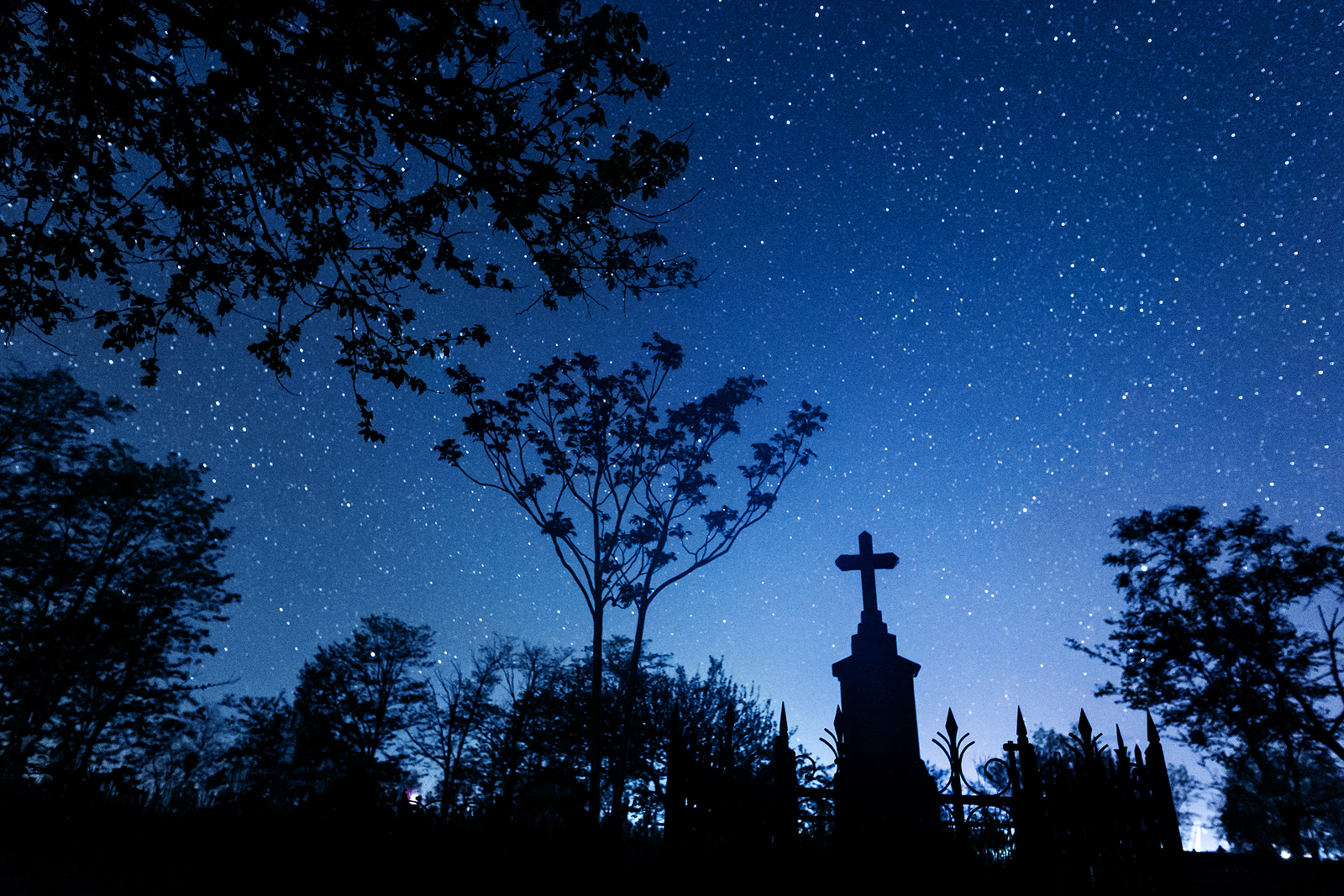 Technicky som mal nastavené čo som chcel, ostávalo doriešiť to, čo je na fotke najdôležitejšie – zaujímavý objekt vo vhodnej kompozícii a svetle. Posúval som sa pomedzi hroby, kládol statív tu i tam až som sa dosť vzdialil od skupinky. Nakoniec som zbadal oproti dedine kríž v malom oplotení. Vzhľadom na to, že z dediny pricházdalo svetlo, nedalo sa fotografovať z bežnej výšky, lebo všetky pouličné lampy i domy by skončili ako priveľmi exponované, prepálené miesta. Napadlo mi, že keď dám fotoaparát dosť nízko, svetlá z dediny prikryjú ďalšie pomníky a porast. Tak som to skúsil a naozaj. Nielen že priame svetlá sa stratili, ale z dediny vyžarovala žiara, ktorá dodala poslednému záberu zvláštne čaro v podobe aury.