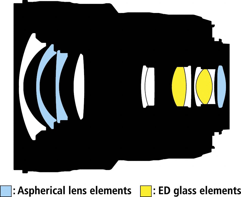 Konštrukcia objektívu12 prvkov vo 8 skupinách (2 ED a 3 asférických prvky)