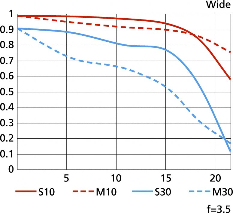 AFS_18_35_ED_MTF_WMTF krivky pre širokouhlý koniec objektívu 18mm (hore) a pre 35mm (dole). Keď krivky porovnáme s predchádzajúcim modelom 18-35 AF-D, zistíme, že sa ostrosť vylepšila v celej ploche obrazu.