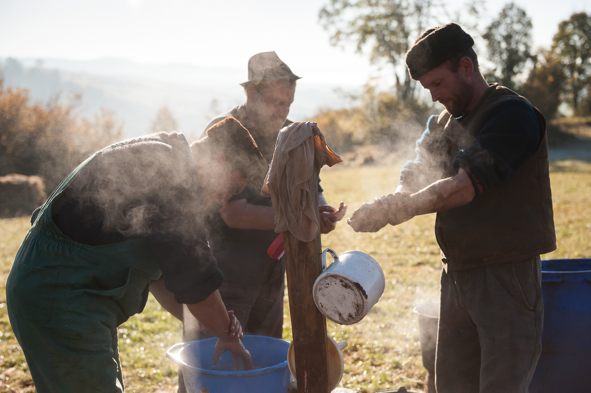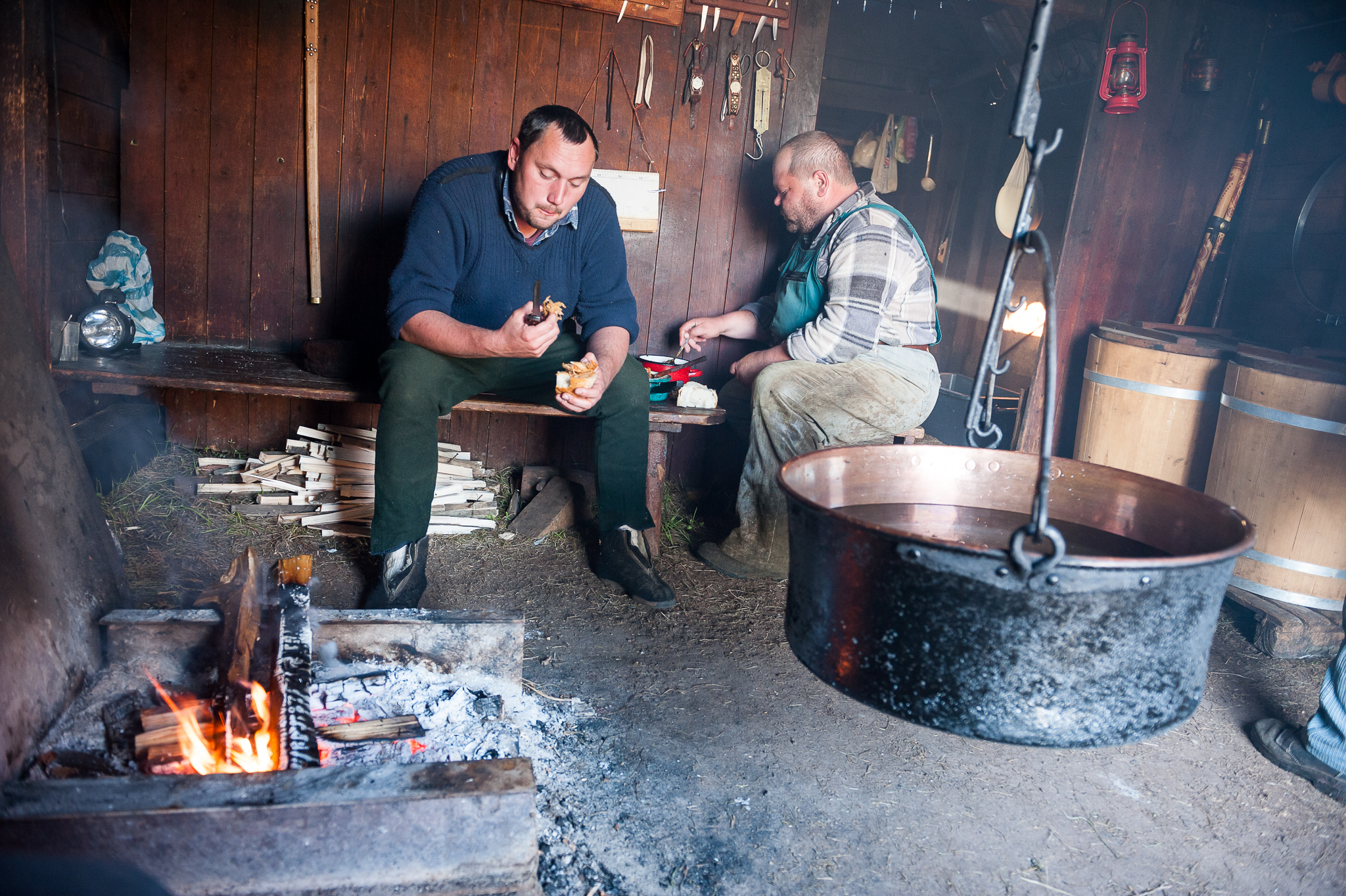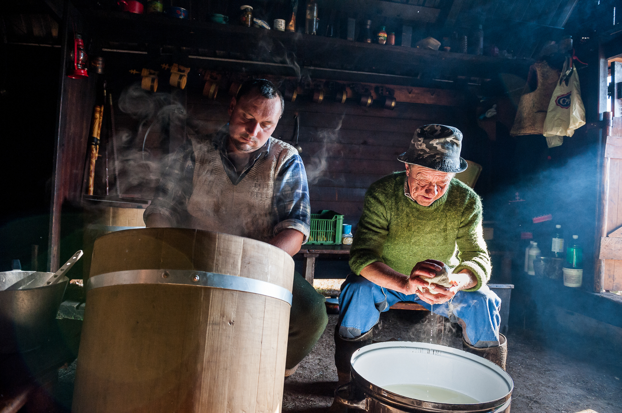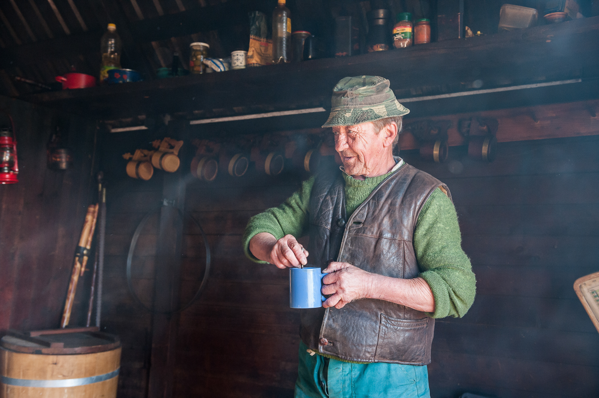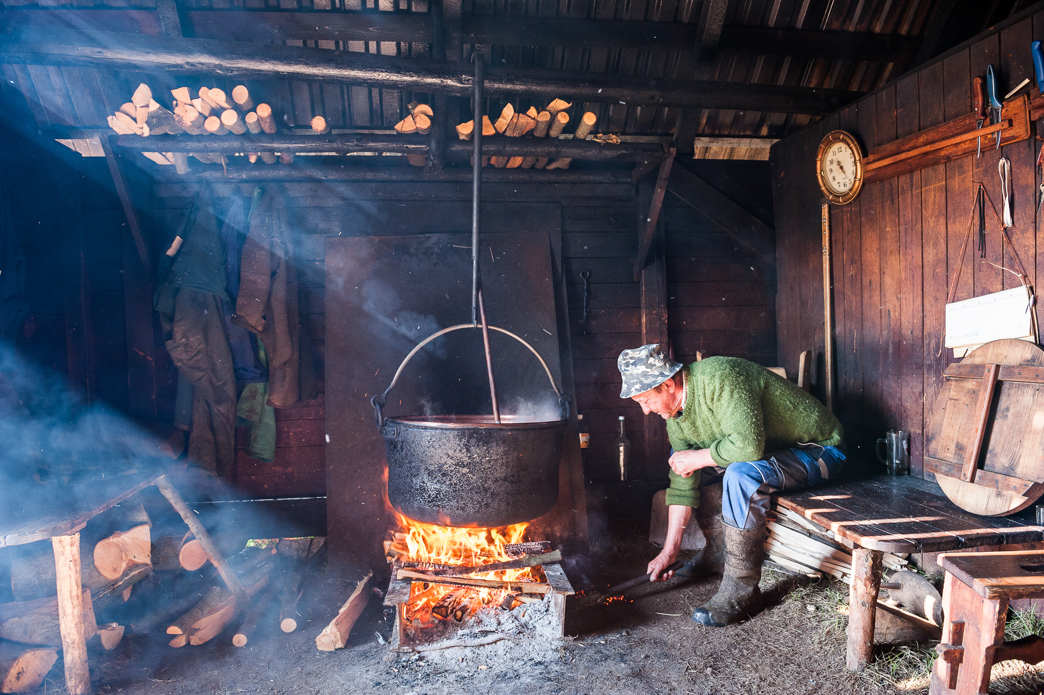 Peter má dnes službu. Vstáva ešte potme, rozkladá oheň v bačovni a varí čaj alebo kávu podľa včerajšieho želania baču a ostatných honelníkov. Chcel by som ho pritom nafotiť, ale po noci plnej príbehov akosi nevládzem. Ostýchavé jazyky rozviazané páleným mi ešte stále znejú v ušiach. Roztrasené hlasy od dojatia z osudov vlastných i svojich bratov na salaši… Veru, zišli sa tu chlapi s neľahkým životom tam dolu medzi ľuďmi. Tu však ich oči žiaria do blízkej pahreby i do nekonečných hviezd. Na ťažký život ostali spomienky, ale príroda a čas všetko hojí. Som zvedavý, čo najbližších pár dní so sebou prinesie. Pred očami mám vážny výraz baču, ktorý vraví: „Nezľakni sa, keď uvidíš veci, na ktoré nie si zvyknutý. Keď uvidíš roztrhanú ovcu alebo opitého chlapa.“