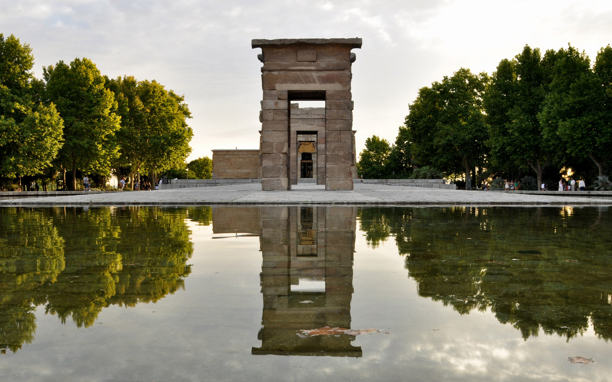 Výlet do „středové“ architektury zakončíme fotografií starověkého egypského chrámu Debod, který byl rozebrán a znovu sestaven v Madridu. Ano, záběr na tři kamenné pylony stojící za sebou, který použil Michal Štrba, se nabízí sám o sobě. Odrazu ve vodní hladině by nevyužil jen naprostý ignorant, takže je vlastně všechno v pořádku 🙂