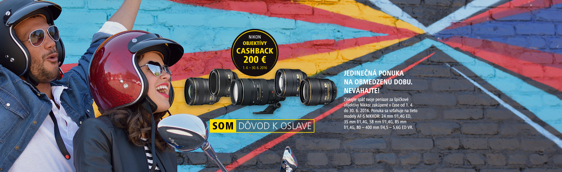 Spoločnosť Nikon pripravila pre svojich fanúšikov jarný cashback pri kúpe pevných objektívov Nikkor AF-S 24mm, 35mm, 58mm a 85mm so svetelnosťou f/1,4 a výkonného teleobjektívu AF-S 80-400mm f/4,5-5,6. Ak si tieto objektívy zakúpite v čase od 1.4.2016 do 30.6.2016 a požiadate o vrátenie prostriedkov do 31.7.2016, Nikon vám pošle späť na účet 200€ za každý jeden z týchto objektívov.