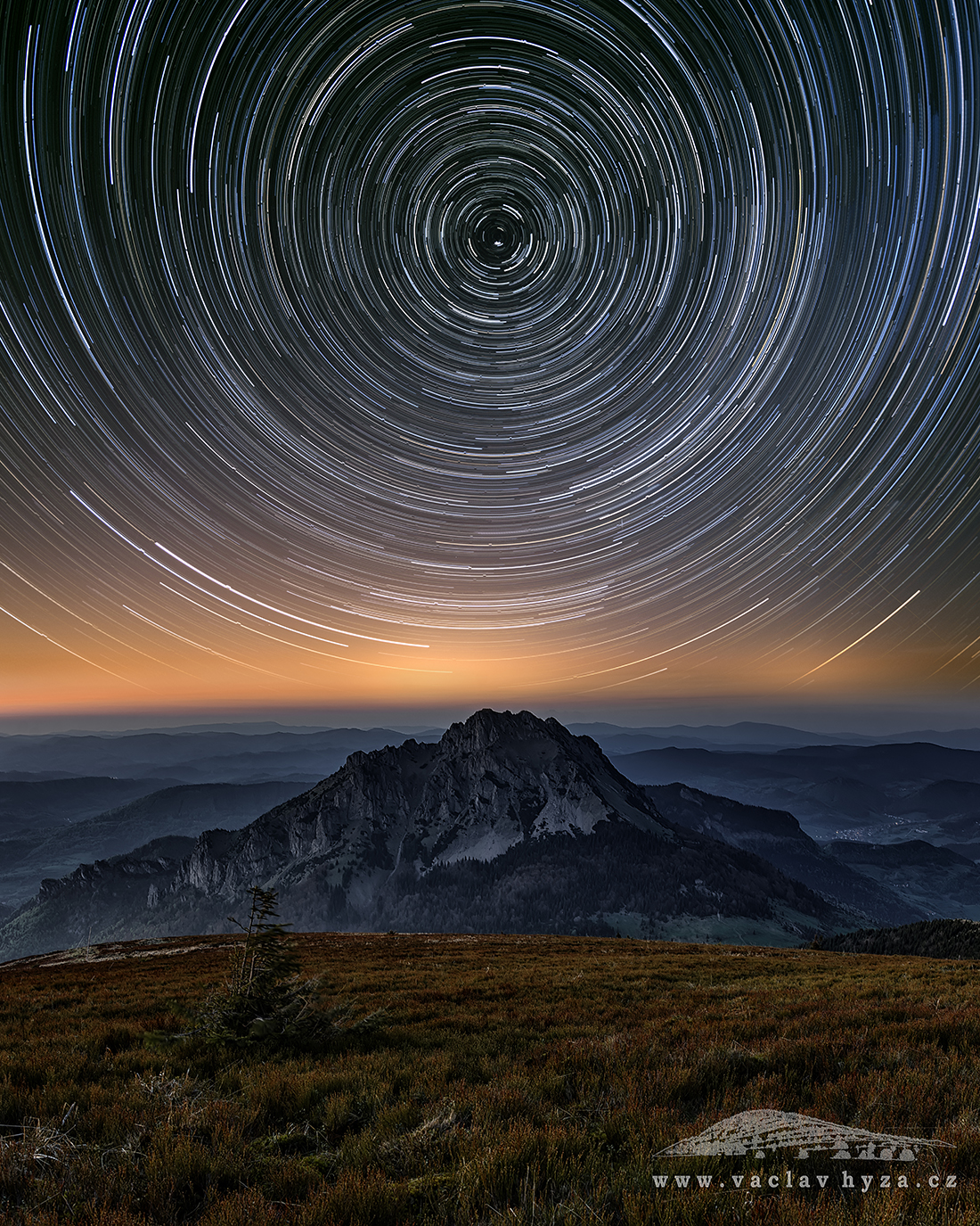Panorama ze 17 snímků. Krajina: 9 snímků + 1 DF. 3× plošně ve 3 řadách. Hvězdy: 6 snímků + 1 DF. Foceno s pomocí paralaktické montáže