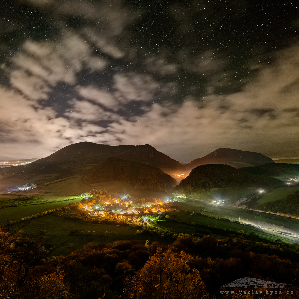 Panorama z 30 snímků. Krajina: 6 snímků, 2× EBKT, 3× plošně v jedné řadě. Hvězdy: 20 snímků +4 DF